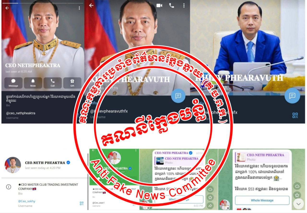 អ្នកនាំពាក្យក្រសួងព័ត៌មាន ច្រានគណនីតេលេក្រាមក្លែងក្លាយ ដែលប្រើប្រាស់ឈ្មោះ និងរូបភាពរដ្ឋមន្រ្តី នេត្រ ភក្ដ្រា (ភ្នំពេញ) : សេចក្តីប្រកាសព័ត៌មាន របស់ការិយាល័យអ្នកនាំពាក្យក្រសួងព័ត៌មាន៖ ថ្មីៗនេះមានជនខិលខូចបានប្រេីប្រាស់រូបថត និងឈ្មោះ ឯកឧត្តម នេត្រ ភក្ត្រា រដ្ឋមន្ត្រីក្រសួងព័ត៌មាន ក្នុងការបង្កេីតជាគណនីតេឡេក្រាម និងបណ្តាញទំនាក់ទំនងសង្គមផ្សេងៗក្នុងចេតនាទុច្ចរិត ដេីម្បីប្រព្រឹត្តសកម្មភាពផ្ទុយនឹងច្បាប់ ដែលទង្វើបែបនេះនាំអោយប៉ះពាល់ដល់ កិត្តិយស កិត្យានុភាពរបស់ក្រសួង ស្ថាប័នរដ្ឋ និងឯកជនភាព កិត្តិយស សេចក្តីថ្លៃថ្នូររបស់ឯកឧត្តមផ្ទាល់ ។