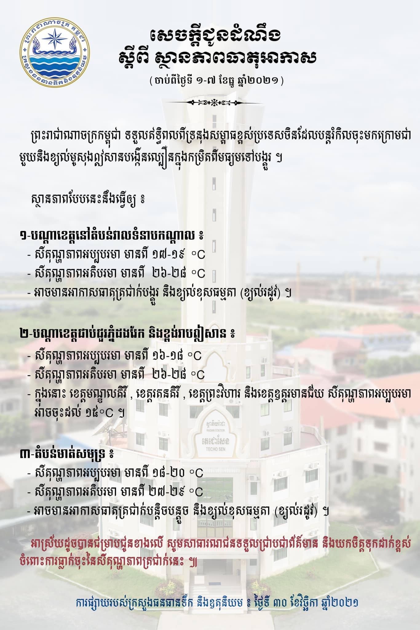 khem sok 4 years ago សេចក្តីជូនដំណឹង៖ ស្តីពី ស្ថានភាពធាតុអាកាស Post navigation Previous ឧបនាយករដ្ឋមន្ត្រី ជា សុផារ៉ា បើកយុទ្ធនាការបង្ក្រាប និងទប់ស្កាត់ចលនាកាប់ទន្រ្ទាន ឈូសឆាយដីព្រៃលិចទឹក នៅតំបន់ទន្លេសាប ដោយទទួលបានបទបញ្ជាដ៏ខ្ពង់ខ្ពស់ផ្ទាល់ពីសម្តេចអគ្គមហាសេនាបតីតេជោ ហ៊ុន សែន នាយករដ្ឋមន្ត្រីNext សេចក្ដីសម្រេច ស្ដីពីការអនុញ្ញាតឱ្យបើកដំណើរការឡើងវិញចំពោះអាជីវកម្ម ខារ៉ាអូខេ រង្គសាល និងឌីស្កូតែក នៅរាជធានីភ្នំពេញ ចាប់ពីថ្ងៃទី៣០ ខែវិច្ឆិកា ឆ្នាំ២០២១ តទៅ តាមគន្លងប្រក្រតីភាពថ្មី៕ Leave a Reply Cancel replyYour email address will not be published. Required fields are marked *Comment * Name * Email * Website More Stories ព័ត៌មានសំខាន់ៗ ដងបនកលលើើលម 2 weeks ago khem sok បទល្មើស ព័ត៌មានសំខាន់ៗ លោក សុំ សុវណ្ណារិទ្ធ មេគយខេត្តព្រះសីហនុ កំពុងត្រូវប៉ាន់ជាមួយទំនិញ គេចពន្ធដែលនាំចូលជាចំហ 2 years ago khem sok ព័ត៌មានសំខាន់ៗ សន្តិសុខសង្គម អុញនោះបែកធ្លាយ ! ប្រធានស្ថានីយ៍ជញ្ជីងថ្លឹងរថយន្តផ្លូវជាតិលេខ៦Aចំណុចថ្នល់កែង ស្រុកបាធាយ ខេត្តកំពង់ចាម ដែលថ្នាក់លើដាក់ឱ្យមើលសុវត្ថិភាពផ្លូវ បែរជាពង្រីកបក្ខពួកប្រមូលលុយពីរថយន្ដធុនធំដឹកលើសទម្ងន់ទៅវិញ 2 years ago khem sok